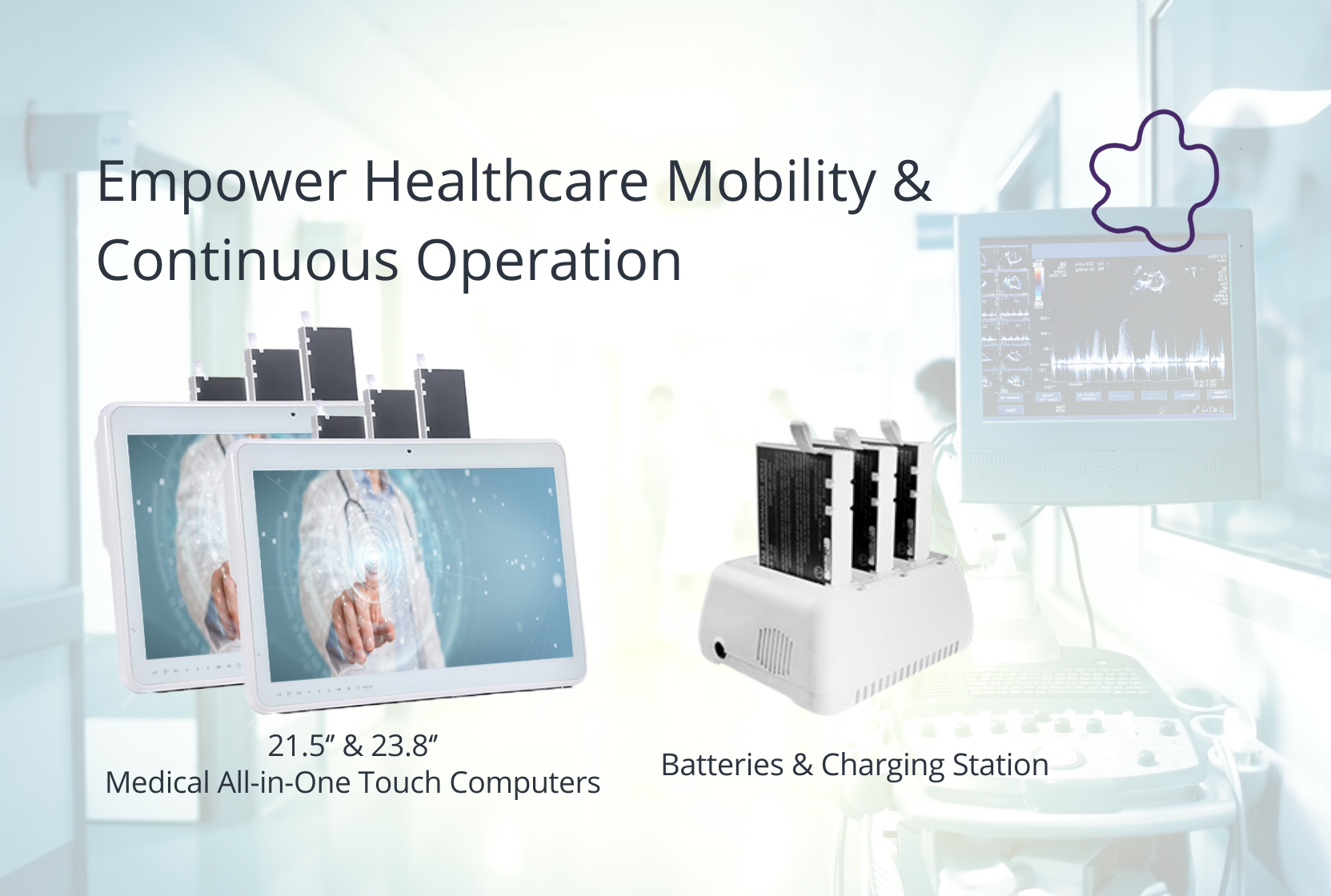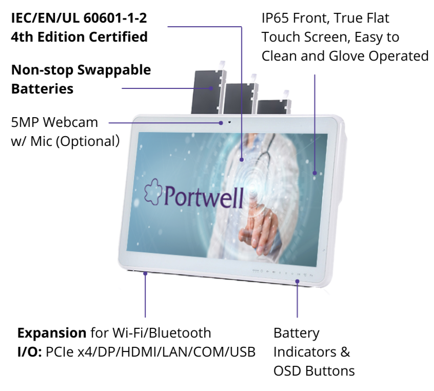 American Portwell's new medical certified all-in-one touch computers, powered by 8th Gen Intel® Core™ CPU (Whiskey Lake) with optional hot-swappable batteries, improve healthcare provider mobility and continuous run time. These fanless touch computers are designed for medical/healthcare applications including surgical imaging/navigation, patient infotainment, mobile nurse station, anesthesia machine, telemedicine, and mobile pharmacy cart.